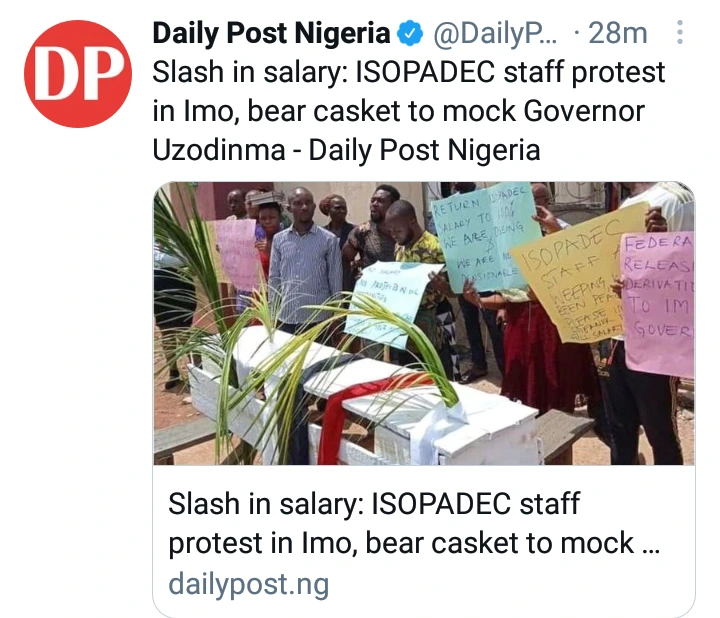 Workers of Imo State Oil Producing Areas Development Commission (ISOPADEC) on Tuesday, took to the streets of Owerri, the Imo State capital, demanding for the return of their salary scale.