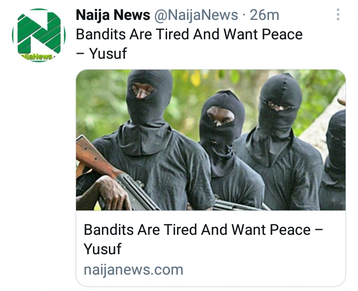 A former executive secretary of the National Health Insurance Scheme (NHIS) Prof. Usman Yusuf has submitted that bandits are tired of fighting and are ready to embrace peace.