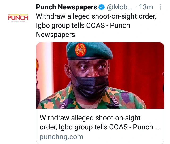 A group of Igbo intellectuals and professionals all over the world, Nzuko Umunna, on Tuesday wrote an open letter to the Chief of Army Staff, Lt. Gen. Ibrahim Attahiru, over the alleged shoot-on-sight order against Igbo youths to soldiers in the South-East and South-South regions.